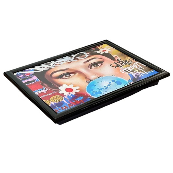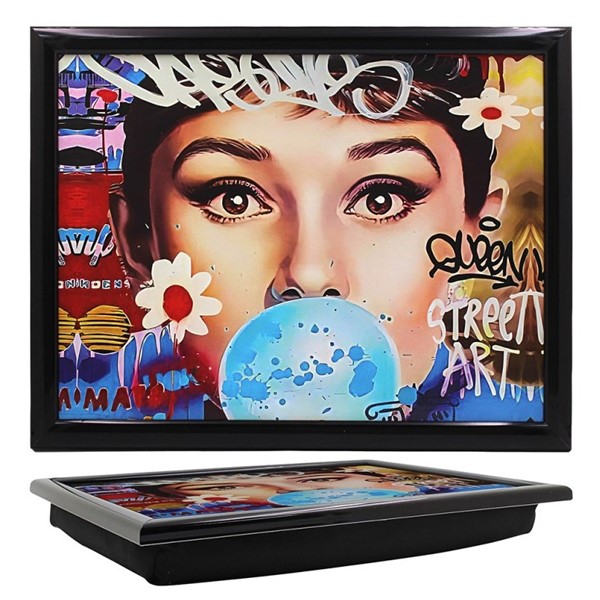 Deze laptray is een waar kunstwerk op schoot. De illustratie – een kleurrijke mix van graffiti, bloemen en een klassieke beauty met blauwe bubbel – verwijst naar niemand minder dan Audrey Hepburn.